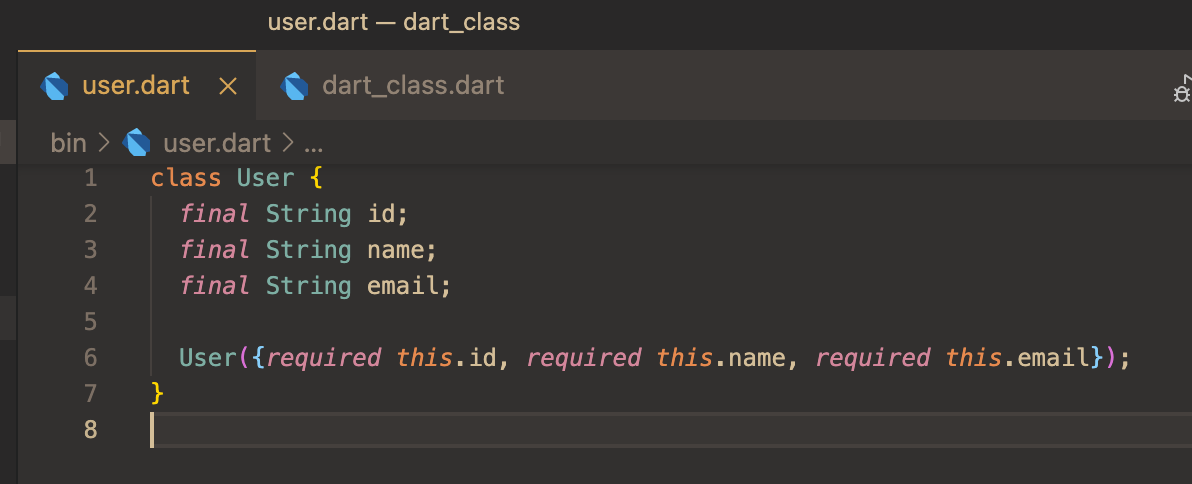 이것을 사용하기 위해 아래와 같이 코드를 user.dart에 넣어줍니다.