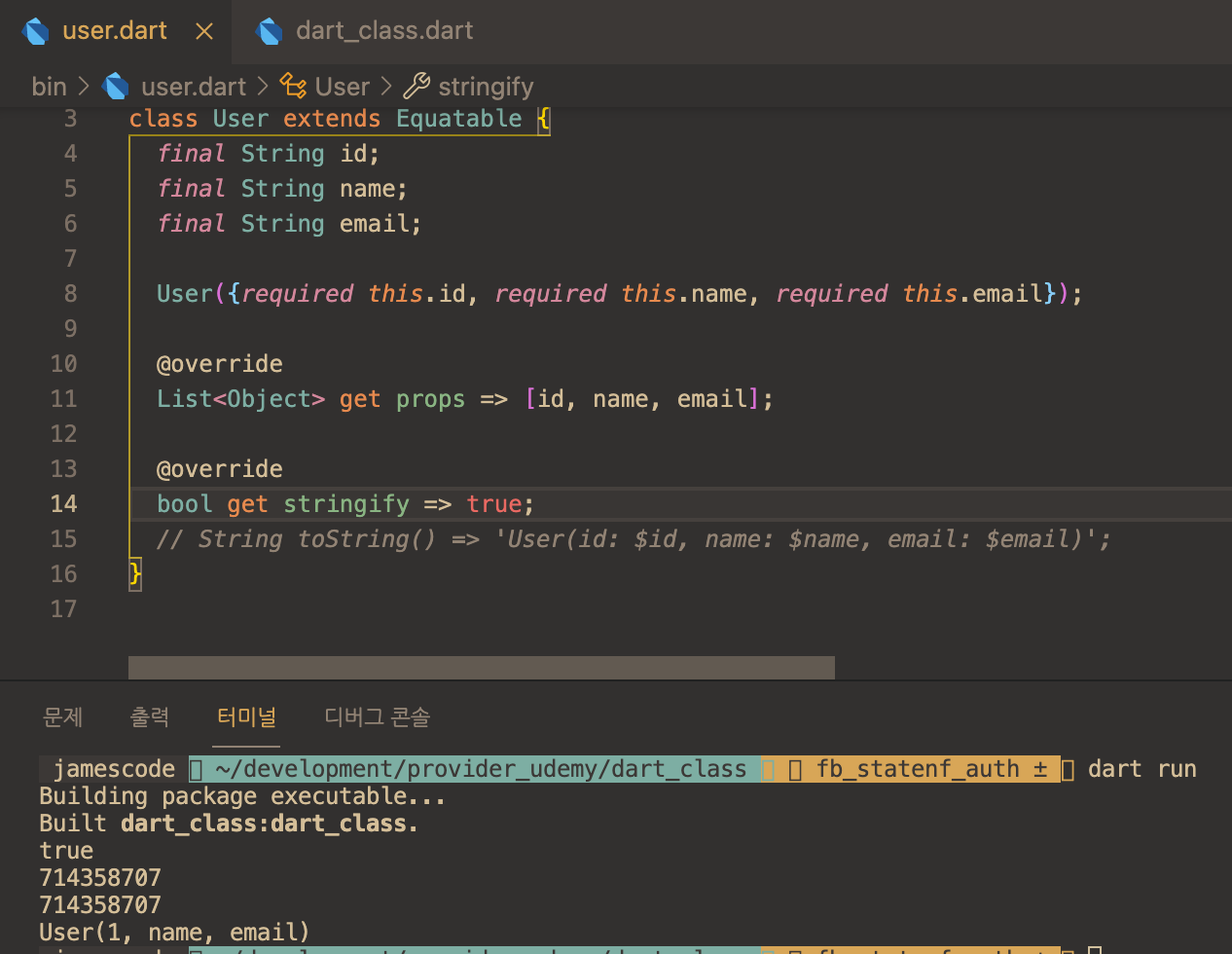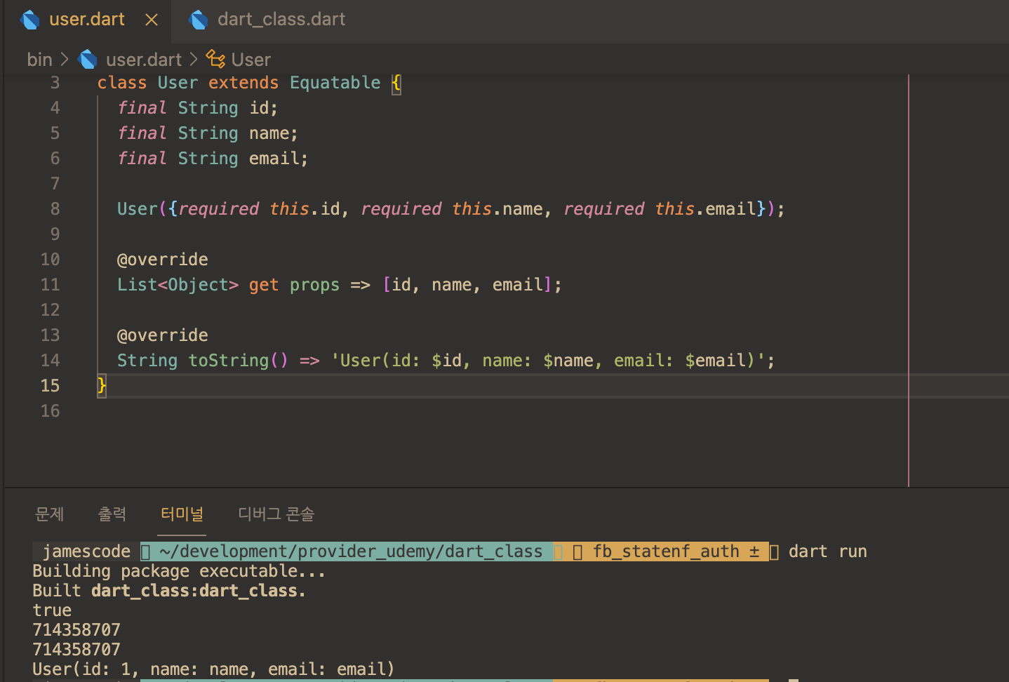 User라는 클래스 이름만 표시되는 걸로는 User 오브젝트의 모양을 추정하기 쉽지 않습니다. 이런 경우를 대비해 있는 게 Equatable에서 제공하는 toString 메소드입니다. Equatable은 props에 나열된 엘리먼트들도 함께 표시하는 toString메소드를 제공해줍니다.